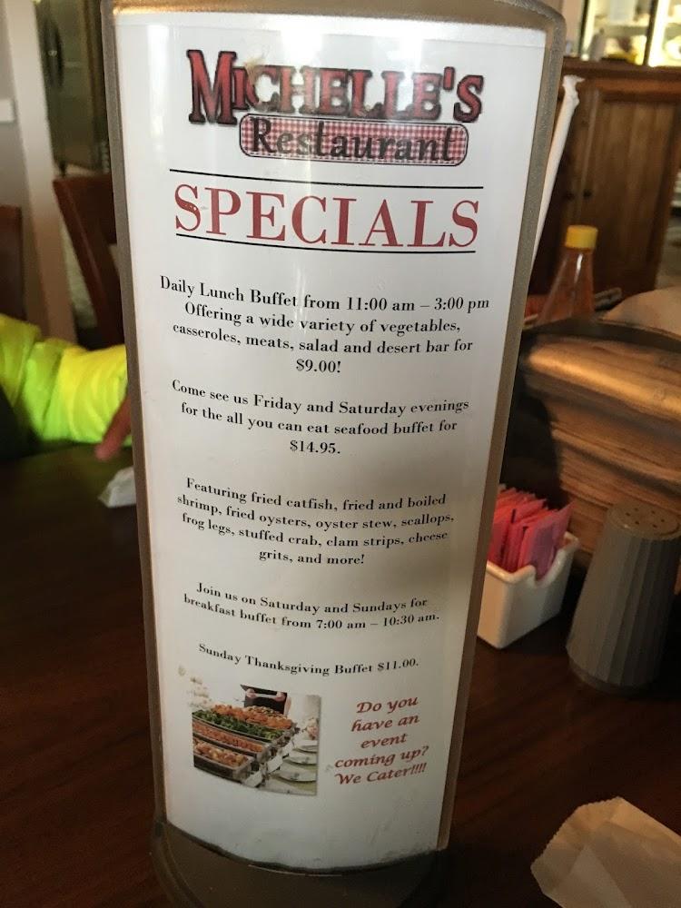 The menu at Michelle's Restaurant showcases the best of Southern cuisine. Diners can choose from hearty breakfast options, including classic omelets and pancakes. The lunch and dinner menus range from fried catfish to BBQ plates. Signature dishes include fried shrimp, frog legs, and a variety of meat and seafood platters. Soups, salads, and sides add to the experience. For those who love sweets, the dessert options, like banana pudding and peach cobbler, stand out. Prices suit various budgets, adding to the appeal of this charming establishment.